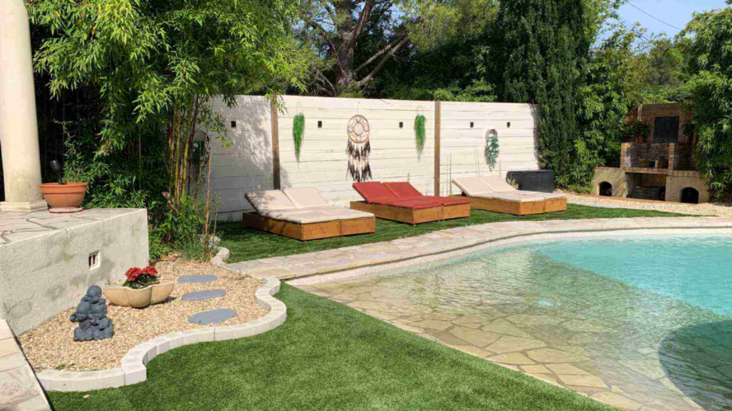 L’atmosphère zen qui imprègne chaque pièce et chaque recoin de la maison se poursuit à l’extérieur, ou la piscine se fond dans le paysage, entourée de végétation apaisante.